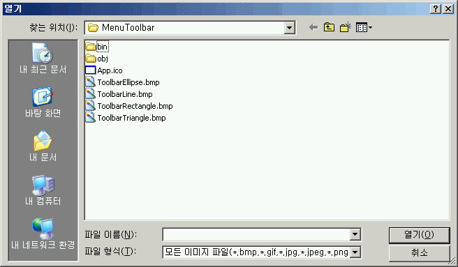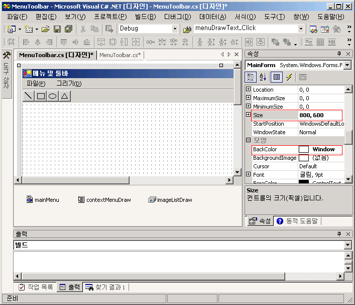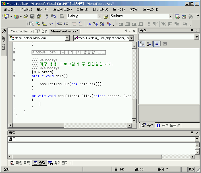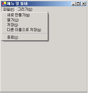 ½ÇÁ¦ ÇÁ·Î±×·¥ Á¦ÀÛ¿¡¼ ¼³¸íÇÑ ¹æ½ÄÀ¸·Î MenuToolbar¶ó´Â ÇÁ·ÎÁ§Æ®¸¦ ¸¸µçÈÄ, ¼Ö·ç¼Ç Ž»ö±â¿¡¼ Form1.cs¸¦ MenuToolbar.cs·Î º¯°æÇϰí, ¼Ó¼ºÃ¢¿¡¼ (Name)À» MainFormÀ¸·Î Text¸¦ ¸Þ´º ¹× Åø¹Ù·Î·Î º¯°æÇϸç, Source¿¡¼ Form1À» MainFormÀ¸·Î º¯°æÇÏ¿© Á¦ÀÛÇÑ´Ù.