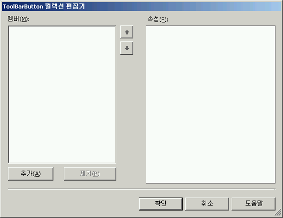 Åø¹Ù¸¦ ¼±ÅÃÇÑ ÈÄ ¼Ó¼ºÃ¢ÀÇ (Name)À» toolBarDraw·Î ¼öÁ¤Çϰí ImageList¿¡ ¾Õ¿¡¼ ÀÛ¼ºÇÑ imageListDraw¸¦ ¼±ÅÃÇÑ ÈÄ, Buttons(Ä÷º¼Ç) ¿· ¹öưÀ» ¼±ÅÃÇÏ¸é ´ÙÀ½°ú °°Àº ´ëÈ »óÀÚ°¡ »ý¼ºµÈ´Ù.