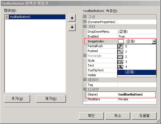 ImageIndex¿¡ ¹öư¿¡ Ç¥½ÃÇÒ ±×¸²À» ¼±ÅÃÇϰí (Name)À» ¼öÁ¤(Áß¿äÇÔÀ» ´Ù½ÃÇѹø °Á¶)ÇÏ¿© Çϳª¾¿ Ãß°¡ÇÑ´Ù. ¼Ó¼º Áß ToolTipText´Â Åø¹Ù ¹öư À§¿¡ ¸¶¿ì½º¸¦ °¡Áö°í °¡¸é »ý¼ºµÇ´Â dz¼± µµ¿ò¸»¿¡ Ç¥½ÃÇÒ ³»¿ëÀ̹ǷΠÀÌ°Í ¶ÇÇÑ ÀÔ·ÂÇØÁֱ⠹ٶõ´Ù.