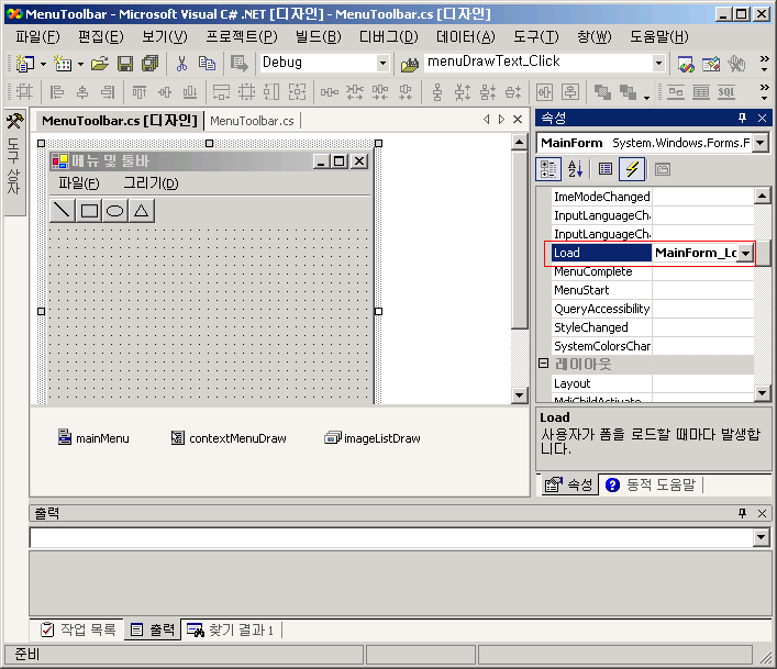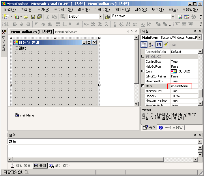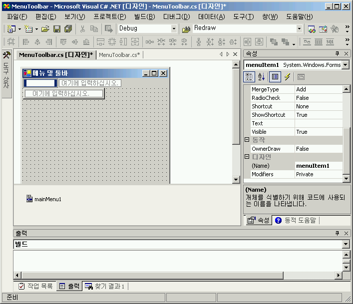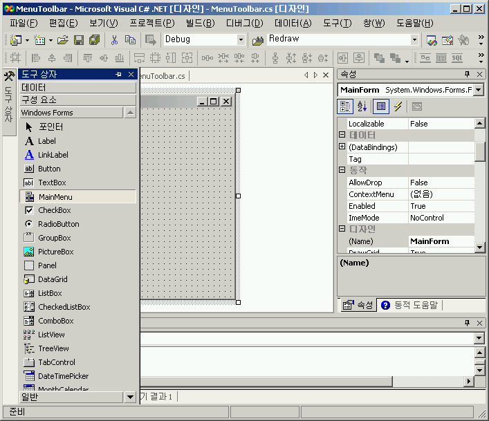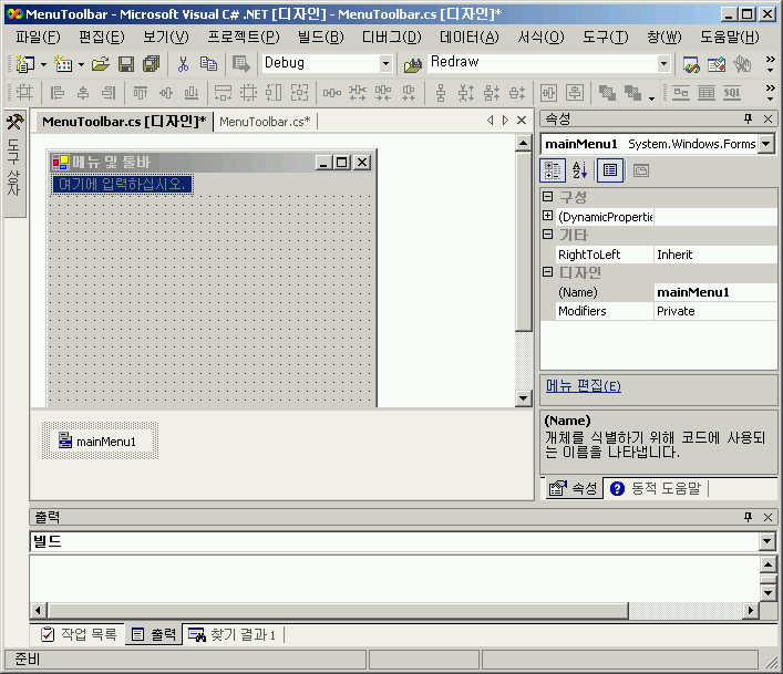 ¸ÞÀÎ ¸Þ´ºÀ» ¼±ÅÃÇϰí MenuToolbar.cs µðÀÚÀ̳ʿ¡ ¸¶¿ì½º ¿ÞÂÊ ¹öưÀ» ´©¸£°Å³ª ¸¶¿ì½º·Î µå·¡±× ¾Ø µå·ÓÇÏ¸é ´ÙÀ½°ú °°ÀÌ ÇÏ´Ü¿¡ MainMenu1ÀÌ Ãß°¡µÈ´Ù.