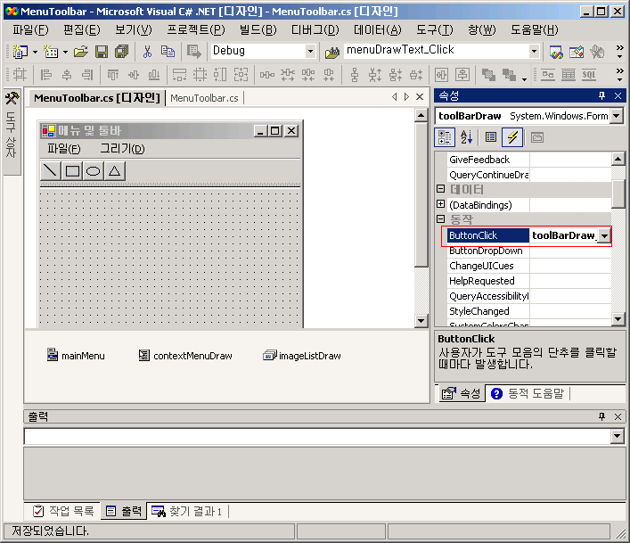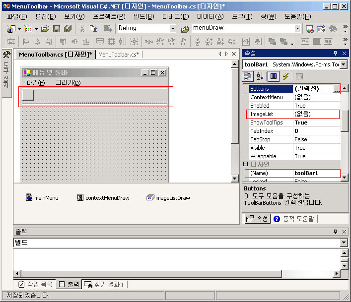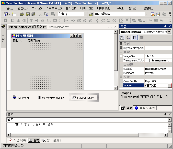 µðÀÚÀÎ ¸ðµå¿¡¼ µµ±¸»óÀÚ¸¦ ¼±ÅÃÇÏ¿© ImageList¸¦ Çϳª Ãß°¡ÇÏ¿© »ý¼ºµÈ imageList1À» imageListDraw·Î ¼öÁ¤ÇÑ´Ù.