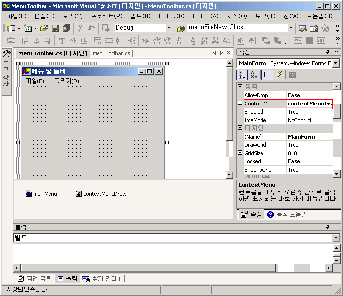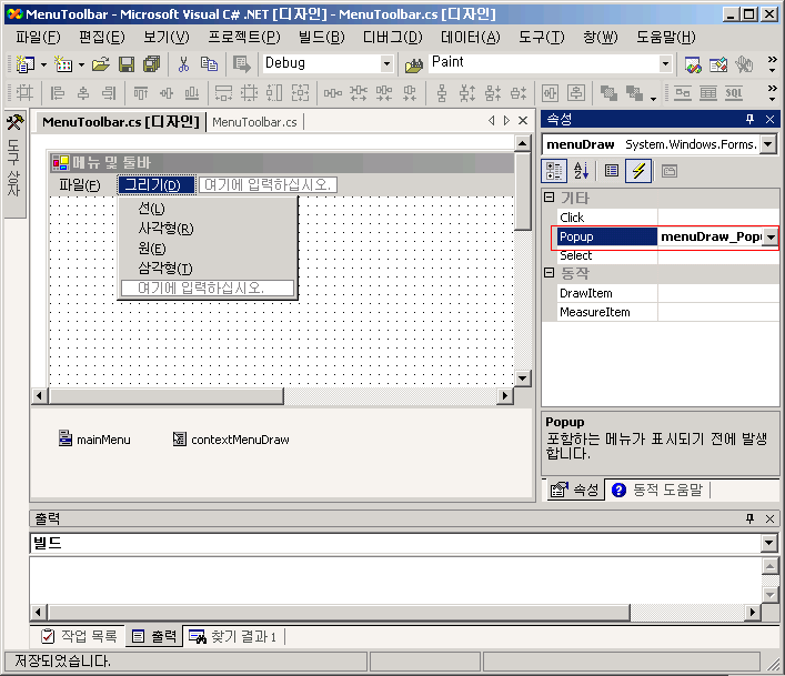 µðÀÚÀÎ ¸ðµå¿¡¼ µµ±¸»óÀÚ¸¦ ¼±ÅÃÇÏ¿© ContextMenu¸¦ Çϳª Ãß°¡ÇÏ¿© »ý¼ºµÈ ContextMenu1À» ContextMenuDraw·Î ¼öÁ¤ÇÑ´Ù.
