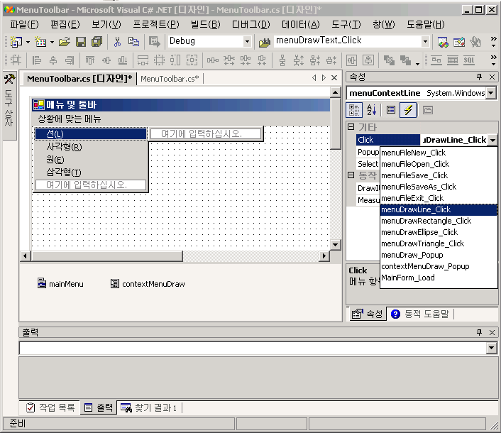 Main ¸Þ´º¿Í °°Àº ¹æ¹ýÀ¸·Î ÆíÁýÇÏ¸é µÇ³ª ´ëºÎºÐ Main ¸Þ´º¿¡ ÀÖ´Â ¸Þ´ºÀ» Ãß°¡ÇÏ°Ô µÉ °ÍÀÌ´Ù. µû¶ó¼ Main ¸Þ´º¿¡¼ º¹»çÇÏ¿© ºÙ¿©³Ö¾î ±¸¼ºÇÑ´Ù. ºÙ¿© ³Ö±â¸¦ ÇÏ¸é ¸ðµç ¸Þ´ºÀÇ (Name)ÀÌ menuItem1°ú °°ÀÌ ÀÚµ¿À¸·Î »ý¼ºµÇ´Â À̸§À¸·Î º¯°æÀÌ µÈ´Ù. ÀÌ À̸§À» MainMenu¿Í Áߺ¹ µÇÁö ¾Ê´Â À̸§À¸·Î º¯°æÇÏ¿© ÀÔ·ÂÇØ¾ß ÇÑ´Ù. ¿©±â¼´Â menuContextPen, menuContextLine µîÀ¸·Î ÀÔ·ÂÇß´Ù.